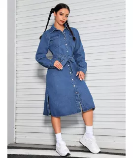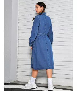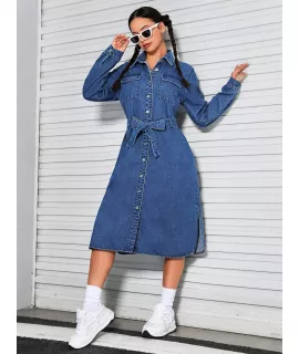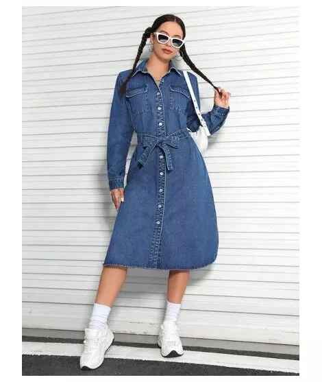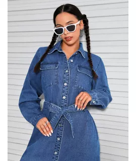 SHEIN EZwear Vestido denim con cinturón y bolsillo con solapa
