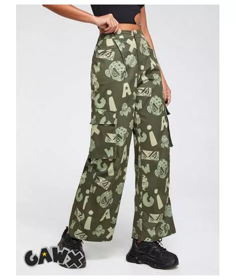 SHEIN GAWX Pantalones cargo con estampado de dibujos animados con bolsillo lateral con solapa