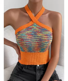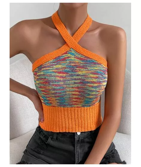 Color: Multicolor, Estilo: Casual, Tipo de Estampado: Color combinado, Escote: Halter, Detalles: Cruzado, Longitud de la Manga: sin mangas, Longitud: Crop, Temperatura: Primavera/Verano (18-25?/63-77?), Tipo de ajuste: Ajustado, Tejido: Estiramiento medio, Material: Lana Peinada, Composición: 50% Poliéster, Composición: 25% Acrílico, Composición: 25% poliamida, Instrucciones de Cuidado: Lavar a mano, no limpiar en seco, Transparente: No