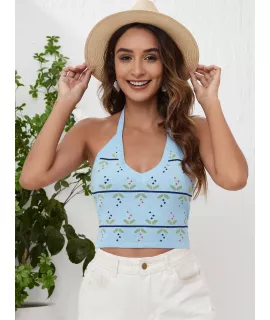 Color: Celeste, Estilo: Casual, Tipo de Estampado: todo estampado, Escote: Halter, Longitud de la Manga: sin mangas, Longitud: Crop, Temperatura: Primavera/Verano (18-25?/63-77?), Tipo de ajuste: Ajustado, Tejido: Elástico Ligero, Material: Tela, Composición: 100% Acrílico, Instrucciones de Cuidado: lavadora o limpieza en seco profesional, Transparente: No